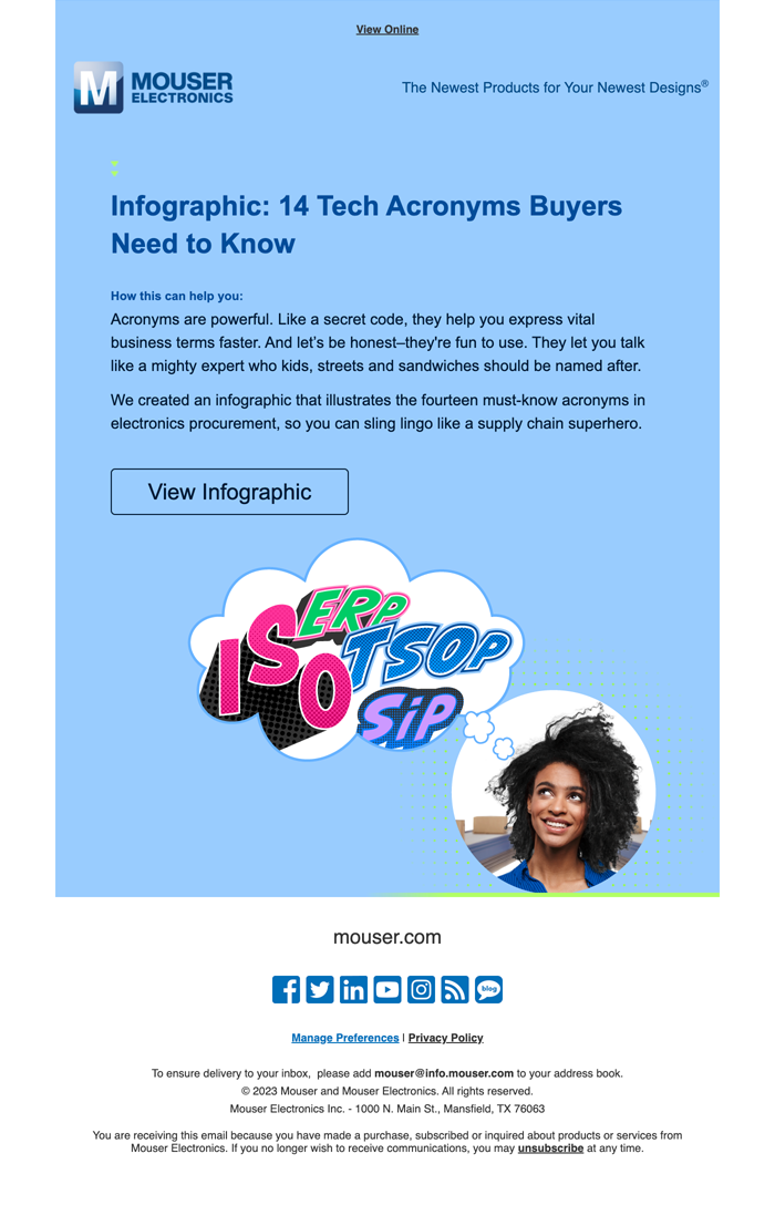One of my biggest goals as Mouser Electronics’ Creative Strategist was to boost content engagement among purchasing professionals. Research revealed that many buyers are thrust into their company’s purchasing department by happenstance. Much of their professional learning and development happen on-the-job and through “tribal knowledge” shared by peers. They need and deserve content that supports them.